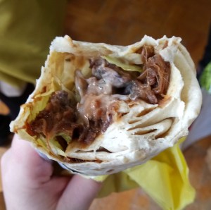 A woman can’t live on cheese and onion pie alone. So why not get a BBQ jackfruit wrap. This one was made by Parallel 7 and it was lovely. While I was waiting outside I heard a bloke talking about a fabulous mock duck dish. I had mine on top of noodles and I was very happy.