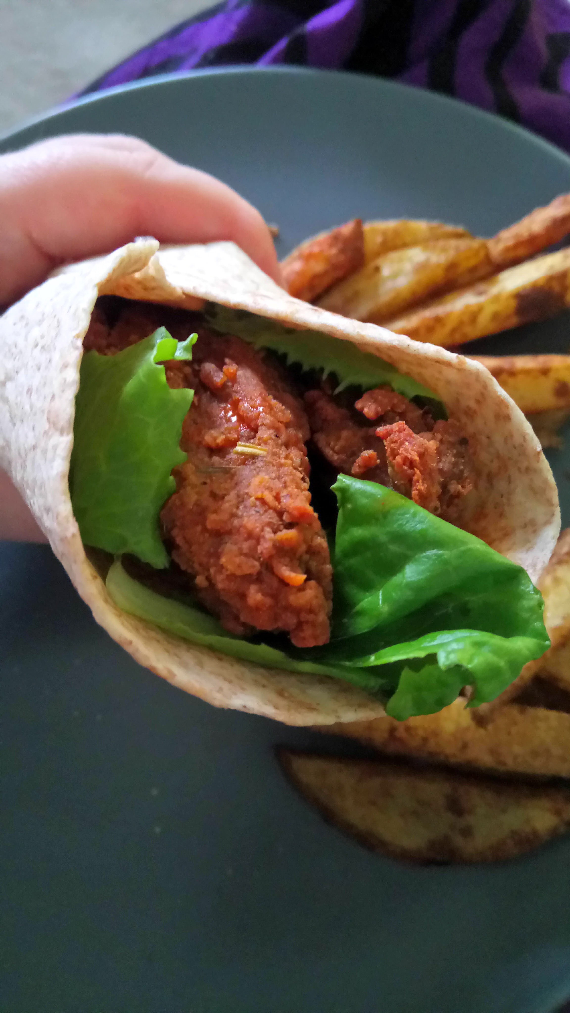 I opted for heating them in the oven and shoved them in a wrap with some lettuce and chilli sauce. It was really nice. Probably a bit cheweyer than chicken would be, but that’s seitan. The coating was thick, flavourful and crisp.