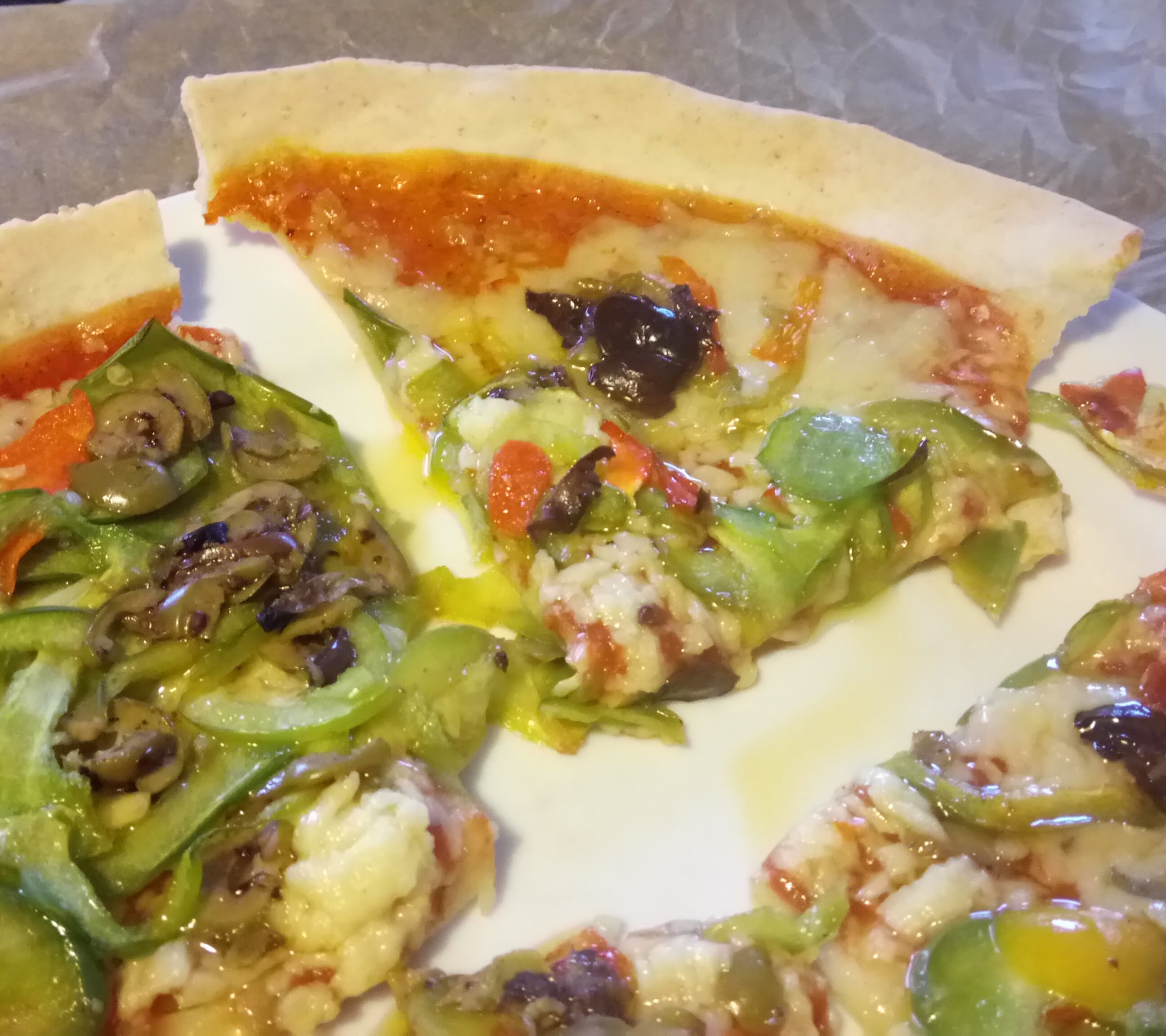 Let’s talk taste, then. I was pleased with the amount of toppings. Pepper and olives will always make me happy. The cheese didn’t taste all that smokey to me, disappointing because I love smokey cheese, but it is nice and creamy. As for the base, well you have to remember that it’s gluten free. It’s not a chewy, bready base. It’s rather cracker like but it is tasty.