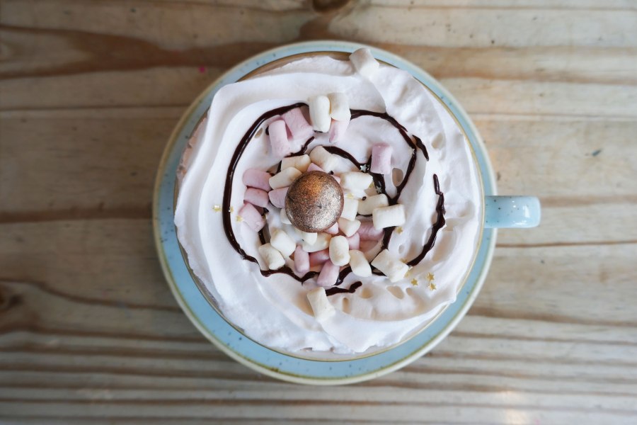 The café offers several vegan lunches — including filled ciabattas, salad, and the soup-of-the-day — but Clare and I were more interested in the sweet options. The contents of the cake cabinet vary from day to day, and we enjoyed vanilla bean cupcakes topped with dark chocolate buttons. What really excited us, however, was the hot chocolate. While many cafés now offer vegan hot chocolate (with the best using oat milk), the Copper Spoon has an entire hot chocolate menu.