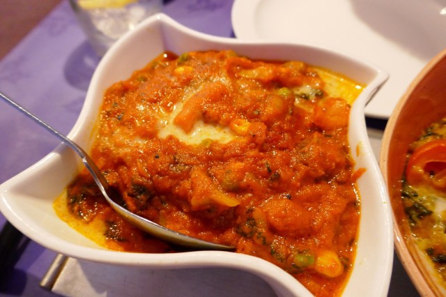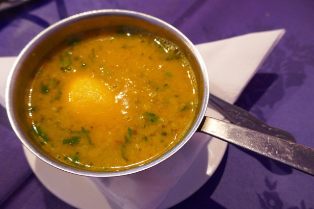 After the customary poppadom course we tried the new vegan starter. Billed as Dal soup we were served a flavourful, thin dal. Perfectly spiced and livened up with a wedge of lemon the soup was delicious. Plus it came in a super cute pan thing.