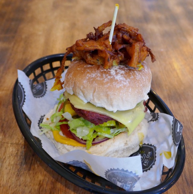The menu is clearly marked for us vegans with a great selection of snacks, burgers and sides. For once in my life I didn’t over order and just got myself a coke and a burger. I got myself the vegan version of the Taj Ma Dahl. You get a delicious burger topped with goodies like avocado, pineapple and mango chow, and yes that is a whole onion bhaji at the top. It a huge burger, and you are not going to look delicate and lady-like eating it. It’s served in a basket which I don’t think is a great choice for a burger that falls apart as you eat it. I want to scoop up my fallen pickles. Basket aside this is one of the best, most creative burgers you are going to find in the bay. The pineapple and mango chow is a highlight.