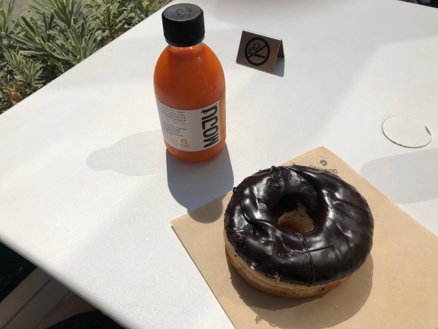 The shop is small with just two tables outside and a bar inside. It has plenty of doughnuts though. I was torn between trying one of the more adventurous combinations or getting something more plain. In the end I went for the Vegan Chocolate Truffle, somewhat between the two.