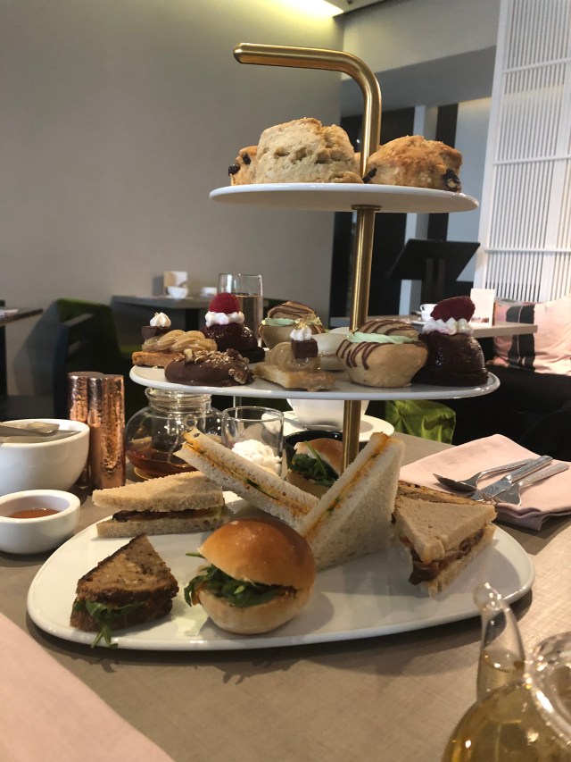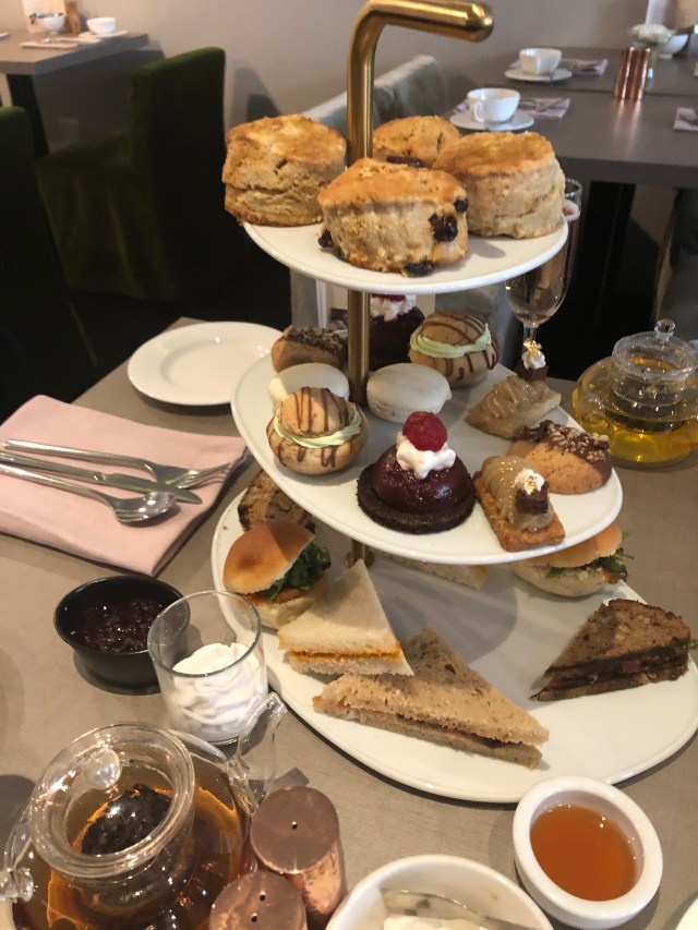 After a brief debate about the merits of tarts we decided to splash out on the Valentine Afternoon Tea (available until the 28th). We were advised to start with the still warm scones. They were served with a berry compote that was wonderfully fruity and perfectly straddled the line between too tart and too sweet, a yummy clotted cream and a vegan honey substitute. As we’d just come from Devon the addition of honey was puzzling to us. Not that it was bad but… honey… on a scone?