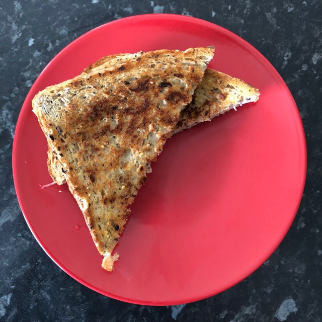 She is absolutely obsessed now though and thought that we should make a grilled cheese for this prompt. Jane’s recipe is, of course, one-third white cheddar, one-third yellow cheddar, and one-third grated American cheese. That’s not going to work for Vegan Mofo so behold my thoughts on the vegan grilled cheese.