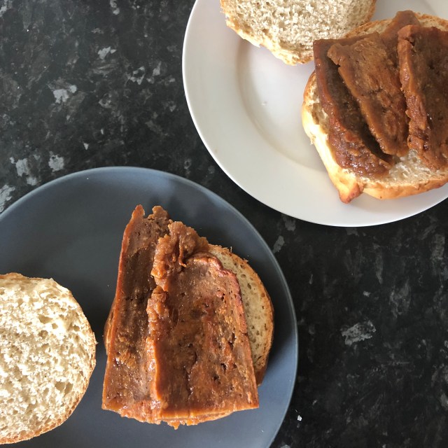 Last year I made a bacon sandwich so this year I thought I’d make another one. Only up my game a bit. To start with I made my own rolls. These are pretzel style burger buns from Vegan 100 which are pretty yummy if not entirely pretzely. I also made my own seitan bacon!