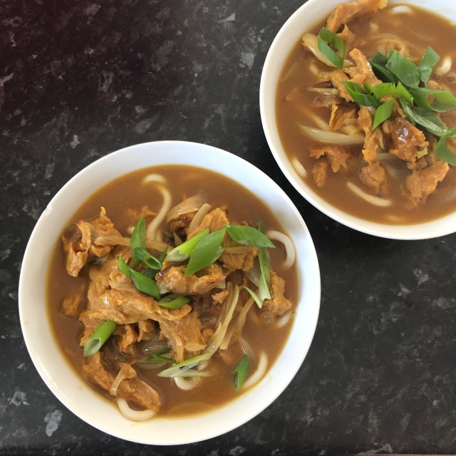 To wrap up I cooked a meal inspired by another blog. I figured at the start of the month that I was probably going to cook something from Herbivore’s Heaven and her trip to Japan but until yesterday I wasn’t sure what I wanted it to be. I mean ideally I’d have gone to that dog friendly theme park with my Dad and Watson but that wasn’t in the budget. I made Curry Udon instead.