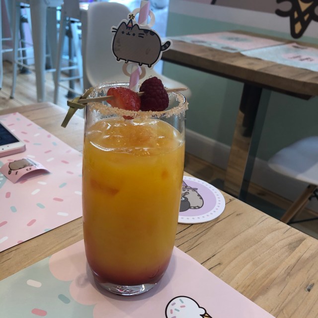 Everything in the cafe comes decorated with Pusheen and pals. At least Stormy and Pugsheen. I didn’t see any Bo, which is slightly disappointing. Bo is my fave. Anyway. All your food and drinks come decorated with little Pusheen bits for you to take home. If you’re like me you’ll be impressed by this regardless of the quality of the food and drink in question. A little Pusheen on my Summer Sunrise (£4)? Yes please.