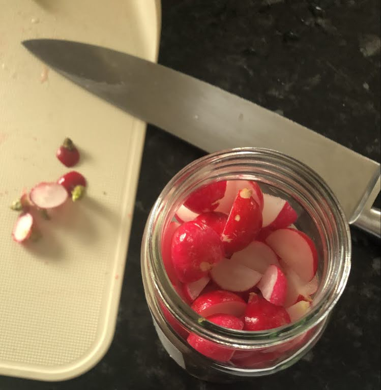 Just before Christmas I got a packet of vegan tempura prawns to try and figured I’d cook up a few other small dishes to go with it. It seemed like a good opportunity to try my hand at Agedashi Tofu. It turns out that I am not skilled at keeping silken tofu together as I deep-fry it. The taste made up for it though. Fresh and subtly sweet. Not exactly what you expect when you heat the oil for deep frying but perfect to eat in the middle of all those rich festive meals. Also with a fresh taste, but by no means a subtle one, I made a batch of citrus-pickled radishes. They’re a mind- and taste-bud-blowing treat.
