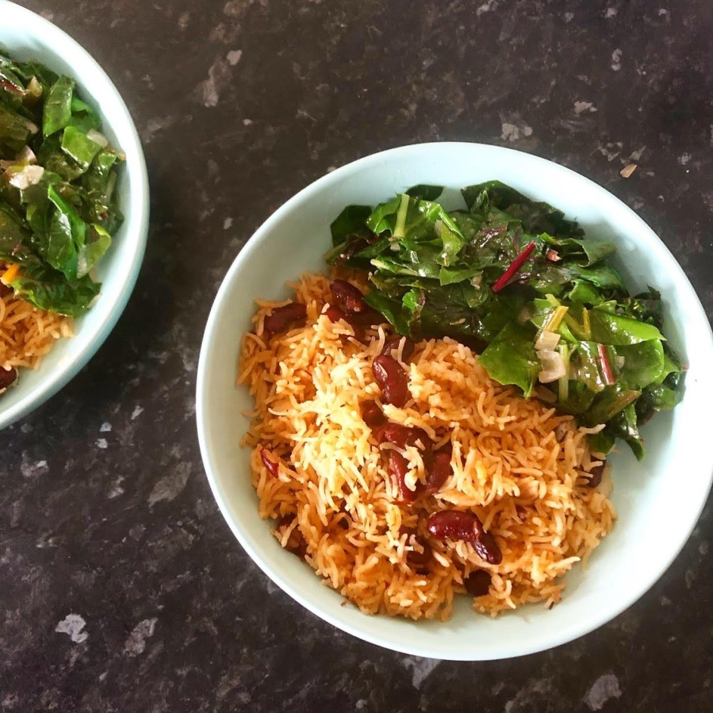 If you want a quick, simple and so, so filling combo this is the one for you. Caribbean Coconut Greens have become a staple around here. Mostly because ordinarily Kate hates chard (on the other hand when I was a veg grower my boss said to me ‘I’ve never seen someone so into chard’ like I was some chard loving weirdo… not the point). The greens here are cooked in with some herbs, a bit of liquid smoke, and coconut cream to make a rich, flavourful side dish. Here it’s served with Island-Style Rice and Beans. And this is the rice and beans dreams are made of. It serves six and we are two so when I make it I have some leftover for the freezer. Not as much as I should though because I keep going back for a little sneaky spoonful.