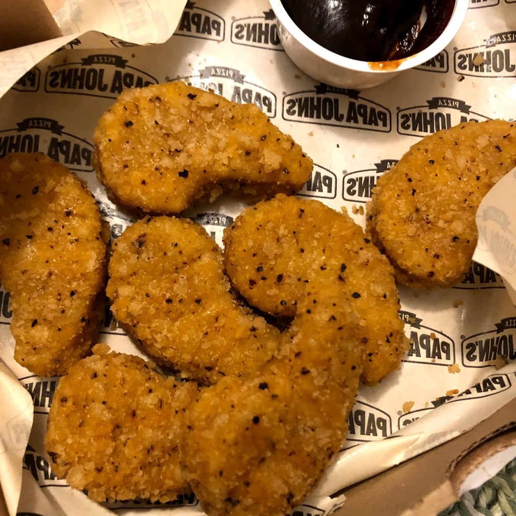 On to chickenish substance number 2: the not-chicken vegan bites from Papa John’s. Let’s start with the positives. The chicken nuggets have a really good texture. The coating tastes okay. The chicken tastes a bit meh. Thank god for dip.