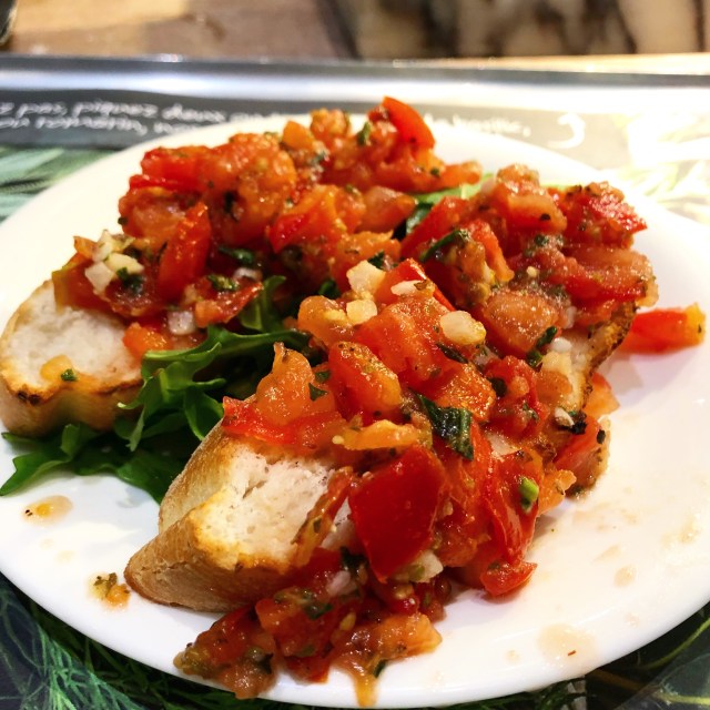 That said the vegan options aren’t massively inspiring. You can have the pasta without the cheese on top or the pizza without the cheese on top. You get the picture. I wanted the bruschetta to start so I went over to the station for that. There was only one man working the station and he wasn’t working terribly quickly. I was waiting behind two people and not going anywhere. So I switched to the pasta station, coming back for the bruschetta after I’d finished that. I waited ages again but finally got my bruschetta. It was good but hardly worth the line.