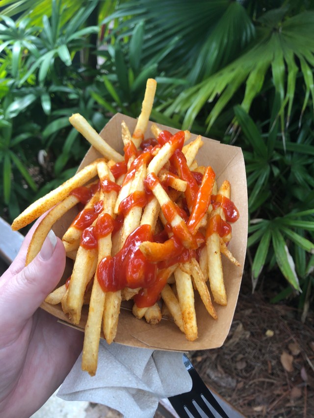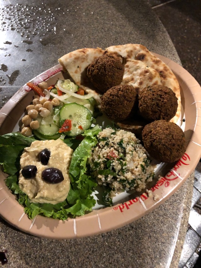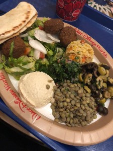 As Animal Kingdom Lodge was our home for two weeks Mara was our regular quick service. There is nothing vegan on the menu, which is irritating, but when I asked what could be made vegan I was offered the choice of the tomato flatbread without ricotta or the falafel without feta cheese and yogurt sauce. I tried the falafel first. It came with bread, hummus and salad. All really tasty. It’s nice to be reminded that falafel can taste great after all the supermarket falafel wraps you have to live through as a vegan.