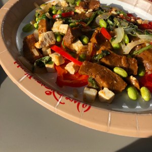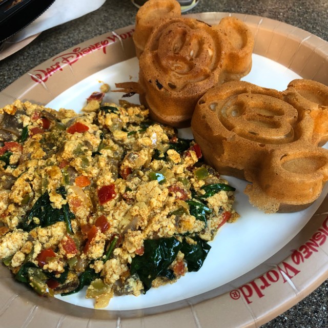 We stayed at Art of Animation on our last visit and it has one of the best food courts on property so we couldn’t resist going back for breakfast. It’s one of the few places that has a vegan option right there on the menu: Vegan Seitan Scramble. It’s really great! Well worth the drive.
